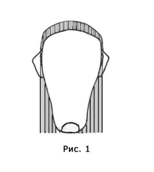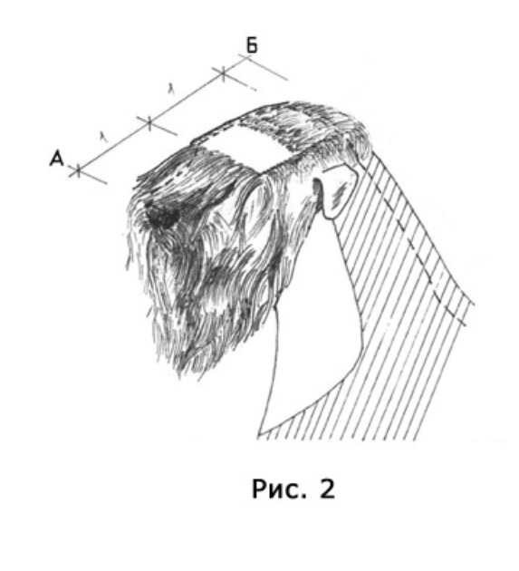 Уши подстрижены как снаружи, так и внутри. на внешней стороне уха оставляют 0,5 см; края аккуратно обрезаются ножницами. На лбу прямоугольный участок от бровей до внутренних краев ушей и шириной с череп (или чуть уже) стрижен близко (0,5 см), возможно, электрической машинкой для стрижки. Переход ото лба к затылку аккуратно стрижется ножницами, чтобы получился плавный переход от короткой шерсти к более длинной (3-5 см) шерсти на затылке, где более длинная шерсть образует пучок. Щеки должны быть плоскими. Голова после стрижки должна быть кирпичной, если смотреть сверху (пропорции от кончика носа до затылка даны на рис. 1), и треугольной, если смотреть сбоку (рис. 2). Чуб должен естественным образом продолжать лоб и подчеркивать его прямолинейную форму, параллельную дуге носа.