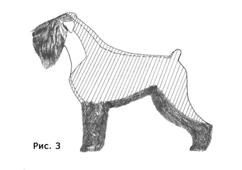 Внутренняя сторона шеи срезается вплотную (0,5-0,7 см) от места соединения нижней челюсти и шеи до грудной (килевой) кости в виде хемизетки. Линия, проведенная от килевой кости вдоль лопатки, будет определять границу между короткой шерстью в нижней части шеи и более длинной шерстью чуть ниже лопатки и на плечах. Переход не должен быть резким. Все линии стрижки должны переходить из одной формы в другую без жеманства, типичного для декоративных пород. Правильно подстриженный перед должен подчеркивать линию плеч и создавать эффект выдвигания вперед (рис.3). Линия фронта плавно уходит вниз. Шерсть на теле (на рисунках отмечена косой штриховкой) оставляют от 3 до 7 см в зависимости от физического состояния собаки и состояния шерсти (типа). По нижней линии туловища, длина шерсти немного увеличивается книзу, образуя юбку вдоль груди и живота. Строгая линия груди, выступающая чуть ниже локтя и переходящая в умеренно подтянутый живот, придает физически хорошо развитой собаке своеобразную дородность. Линия верха должна плавно спускаться от основания шеи к хвосту и подчеркивать холку.