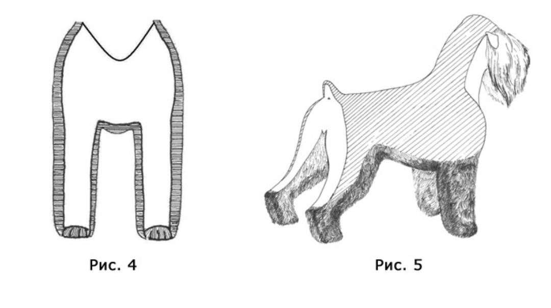 Задняя часть. Заднюю часть задних ног, от 1-2 см выше пятки до анального отверстия, стригут электрической машинкой для стрижки (рис. 5). Шерсть на внешней стороне бедра и части голени оставляют на 3-5 см, плавно удлиняя кпереди, где остается «юбочка», и книзу к пястям. Шерсть на пястях оставлена длиннее в соответствии с зажимом передних лап.